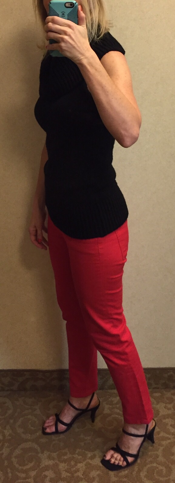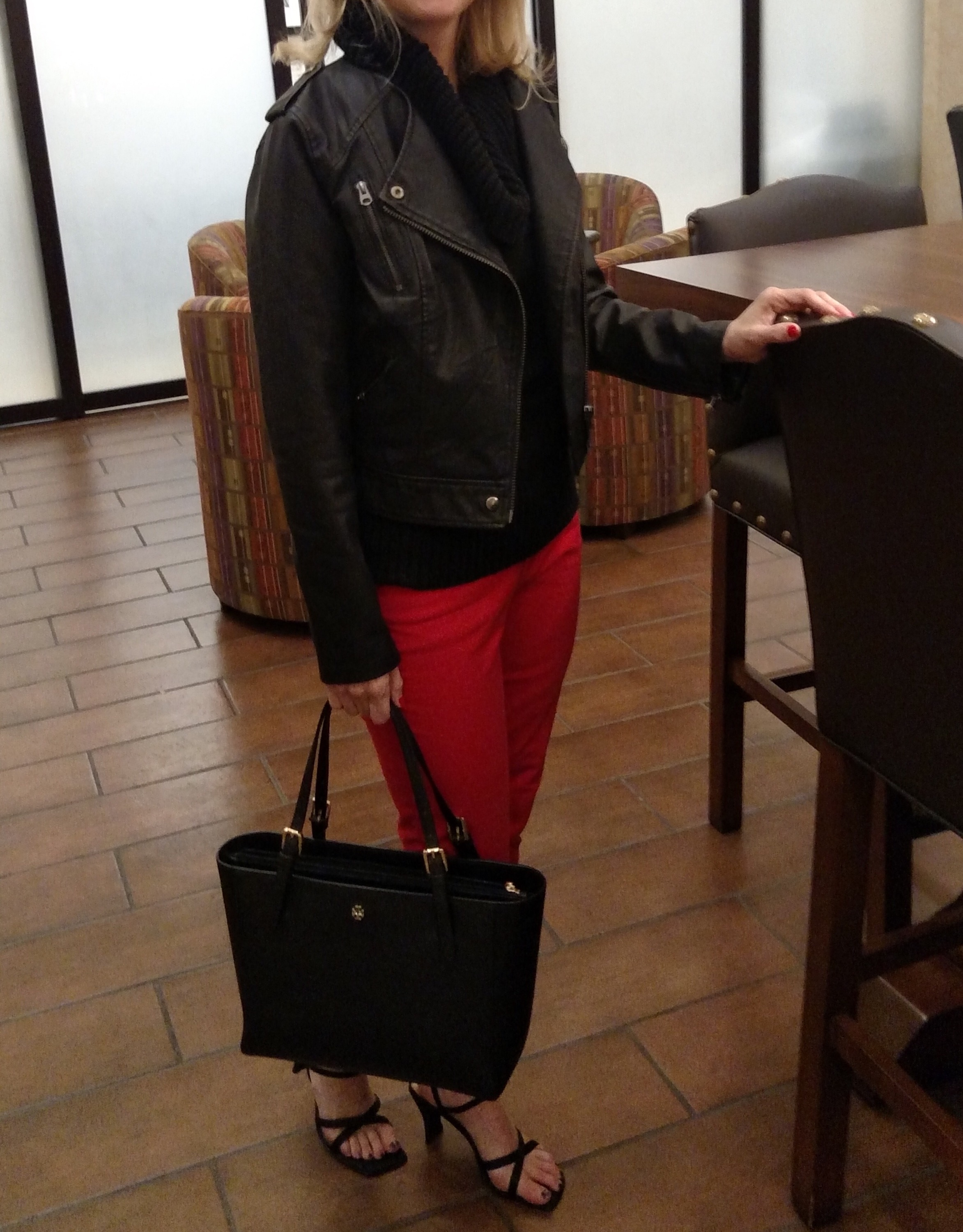 I wore my favorite Stitch Fix jeans (red!) and a sleeveless sweater, and then added a little bit of edge with my Top Shop moto jacket.