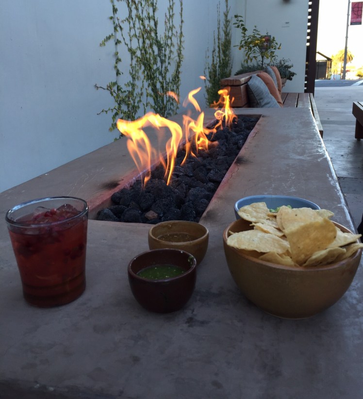 In this outing, as we were headed back toward home when I spotted an inviting terrace. I didn’t know right away it was a restaurant, as there are many businesses in the Presidio as well, but once we could see that it was a watering hole so to speak, it was then quickly suggested that we stop for some “provisions.” After absolutely no arm twisting, we settled around an outdoor fire, ordered up some drinks and guacamole.