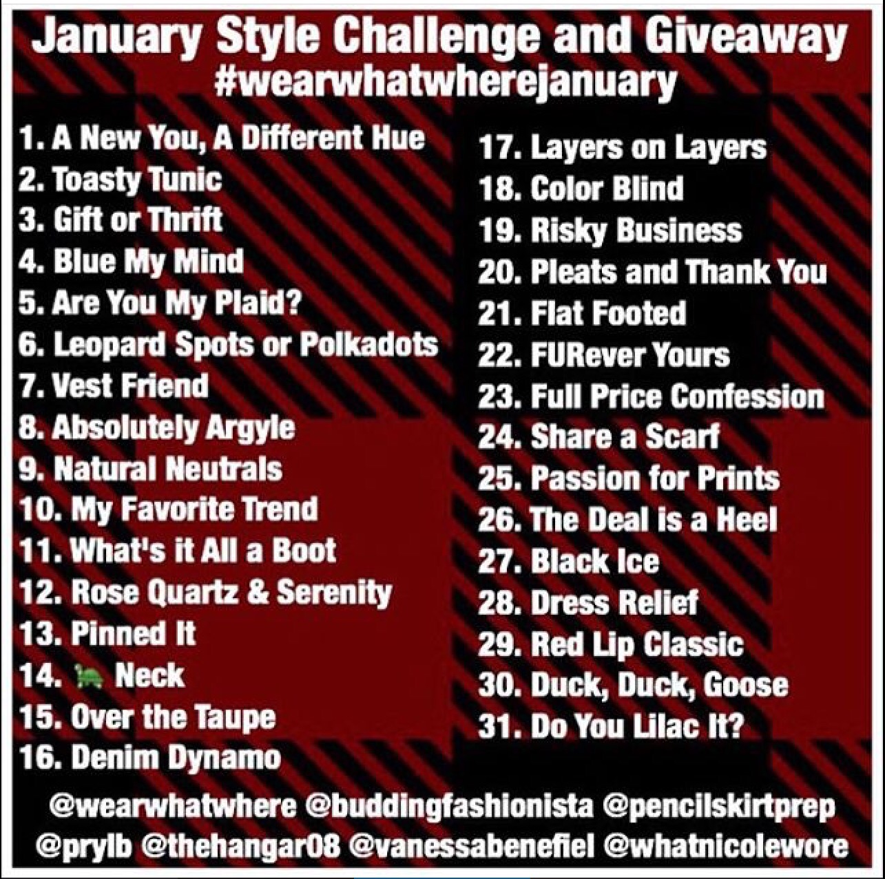 During January, I participated in a style challenge on Instagram. I had never done one before, I had seen the tags “wearwhatwhere….insert month,” but wasn’t entirely sure how it worked. When I saw the list of prompts pop up on the feed of someone I follow, I was intrigued, and decided it could be an interesting way to shop my own closet, come up with new outfits, and see what other people were doing with the same prompts.